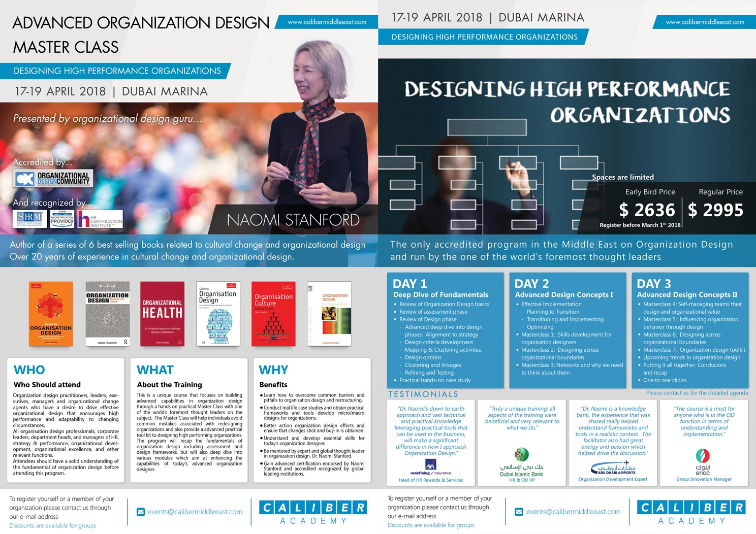 We are excited to announce a unique progressive Master Class led by renowned organization design guru Dr. Naomi Stanford on Advanced Organization Design. This internationally recognized and certified program by leading OD and HR bodies deep dives into next generation organization design concepts while also overviewing fundamentals of Organization Design.  This program will give you advanced best practices and tools to restructure your organizations from a holistic and systems point of view.  In addition, it will allow you to discover new trends and advanced techniques in building optimal organizations.  Organizations which require a need to restructure and optimize their organization designs will gain tremendous value from this workshop event. The program is tailored for advanced practitioners of org. design, who have a solid grasp of fundamentals.