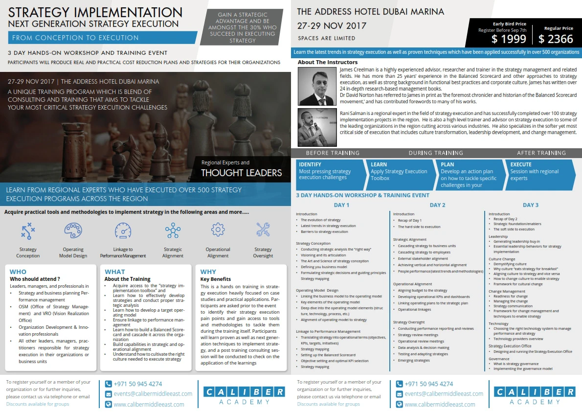 This training program takes participants on a unique learning journey which involves pre-and post training activities.  The program focuses on one of the most critical hurdles organization’s face today, which is strategy implementation.  It is estimated that approximately 70-90% of organizations fail to achieve their intended strategies often due to a number of factors which will be addressed in the course itself.  Delivered by some of the leading regional experts in the field, the 3-day program gives an unparalleled comprehensive toolbox for all six key dimensions of strategy execution.  These dimensions include strategy conception, operating model design, linkage to performance management, strategic alignment, operational alignment, and strategy oversight.  Other than being a very practical course centered around practical cases, exercises, and examples; the certified course aims to give next generation techniques and trends on strategy implementation.