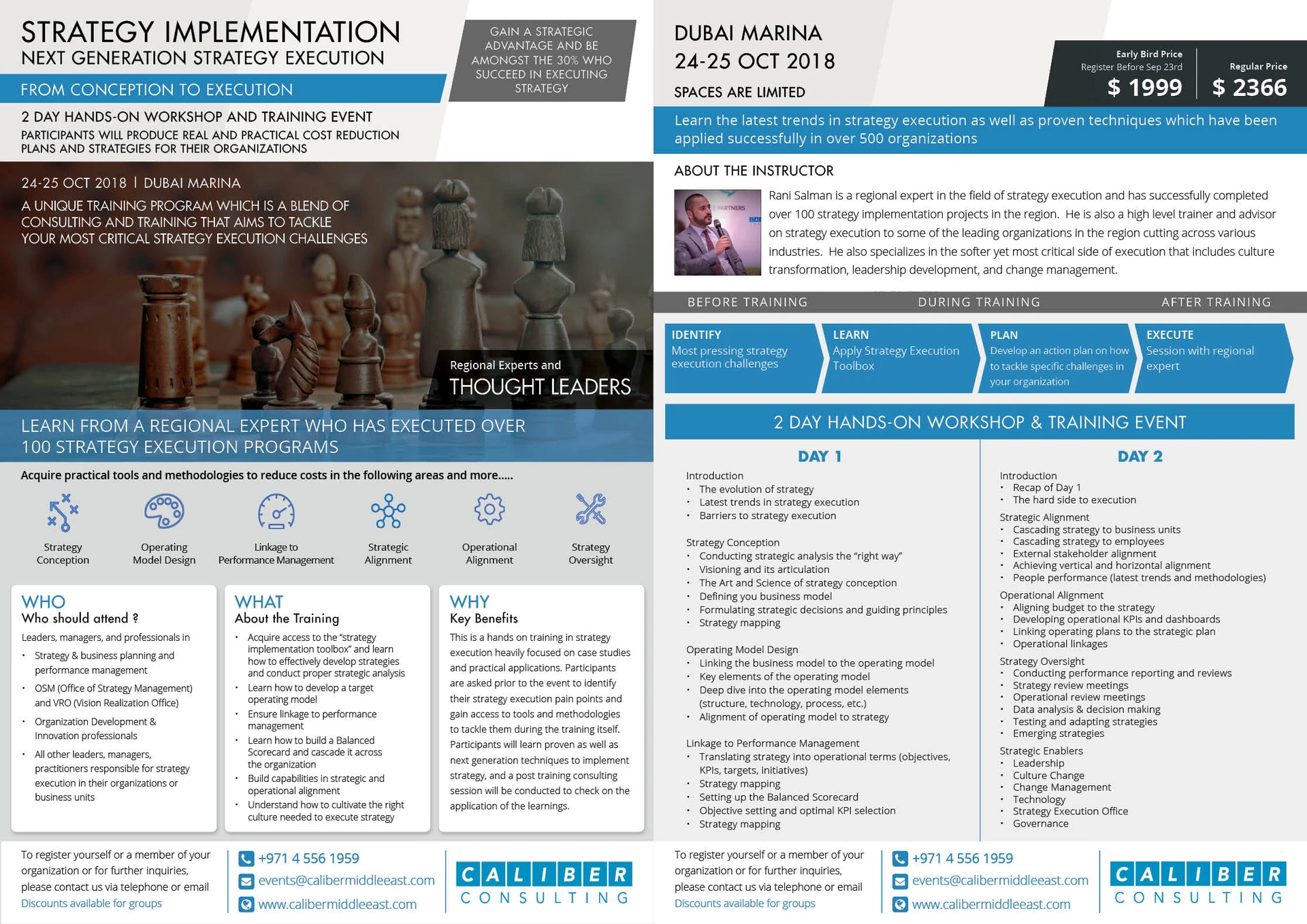 This training program takes participants on a unique learning journey which involves pre and post-training activities. The program focuses on one of the most critical hurdles organization’s face today, which is strategy implementation. It is estimated that approximately 70-90% of organizations fail to achieve their intended strategies often due to a number of factors which will be addressed in the course itself. Delivered by some of the leading regional experts in the field, the 2-day program gives an unparalleled comprehensive toolbox for all six key dimensions of strategy execution. These dimensions include strategy conception, operating model design, linkage to performance management, strategic alignment, operational alignment, and strategy oversight. Other than being a very practical course centered around practical cases, exercises, and examples; this certified course aims to give next-generation techniques and trends on strategy implementation.